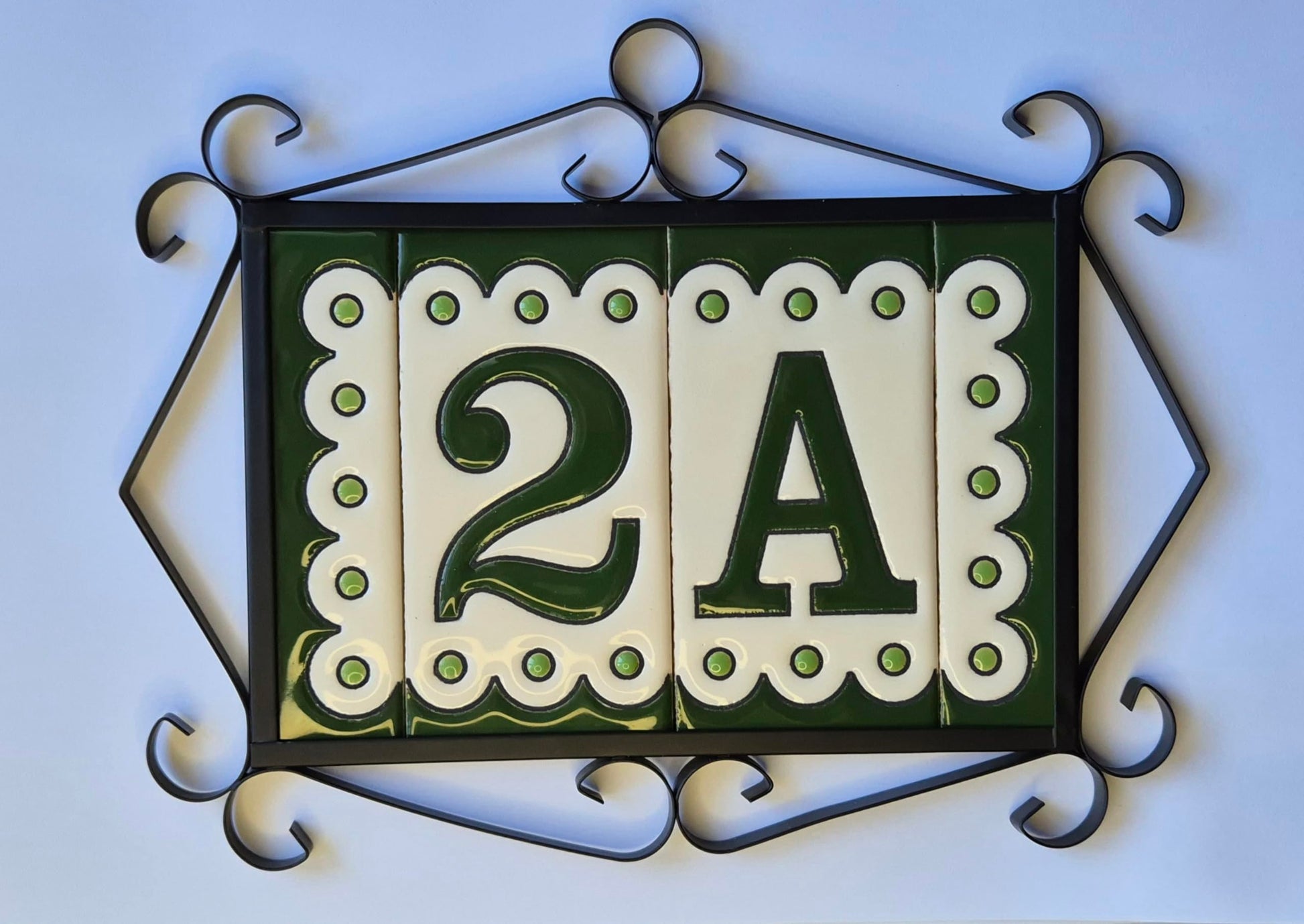 Authentic Spanish Soto designed ceramic tiles each individually hand-painted in vibrant colours. The Soto-designed tiles are made of the highest quality materials. Ideal for a condo, home, or mailbox number. These ceramic house numbers are durable and weatherproof, making them long-lasting. These tiles come with the option of numbers 0,1,2,3,4,5,6,7,8,9 letters A, B, C, and wire filigree frames. These beautiful tiles are sure to give any place a unique plaque that will create comments from guests even before they enter your abode.