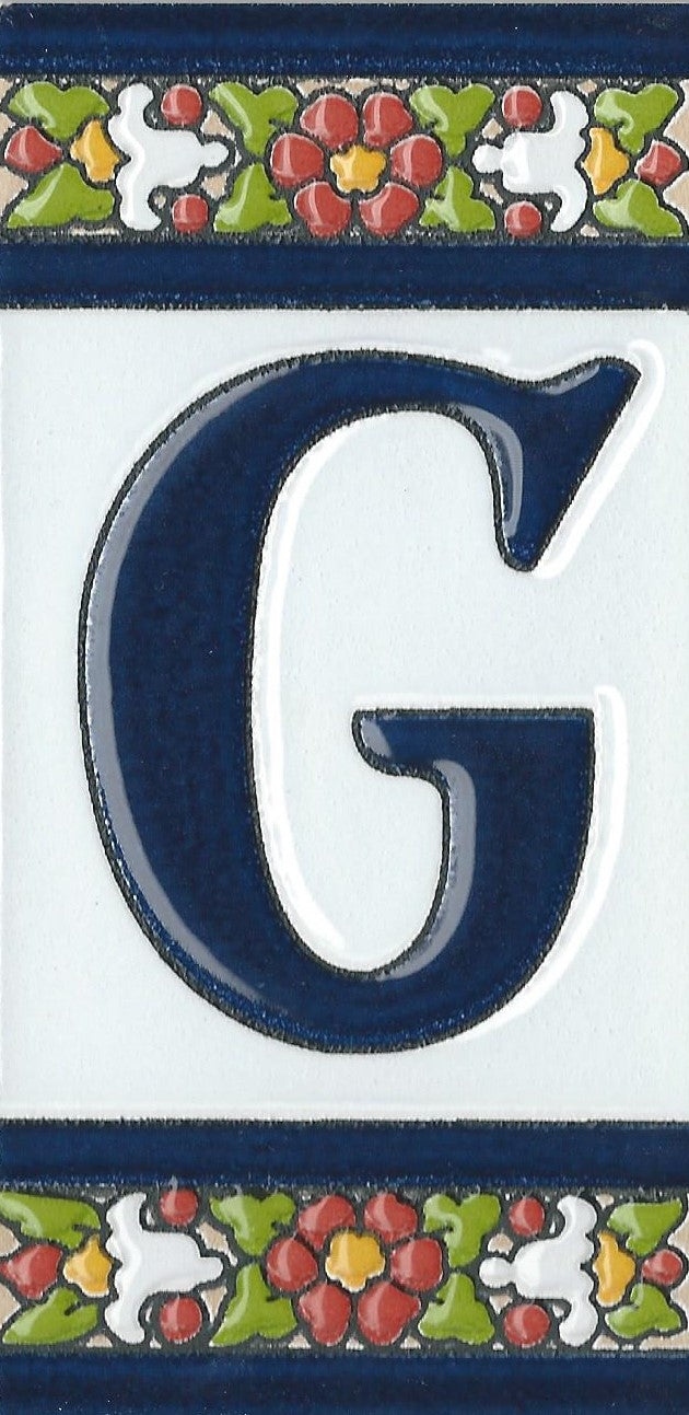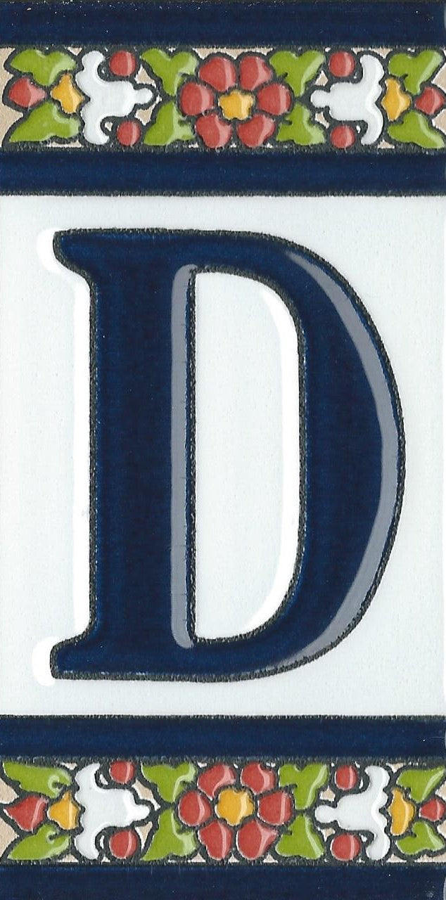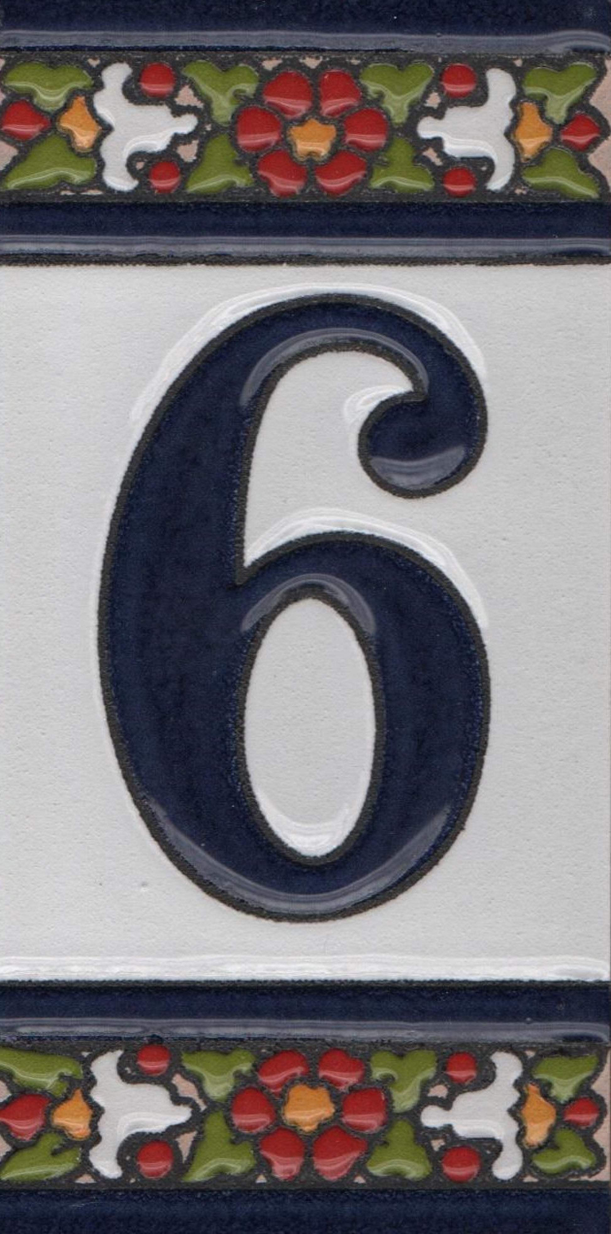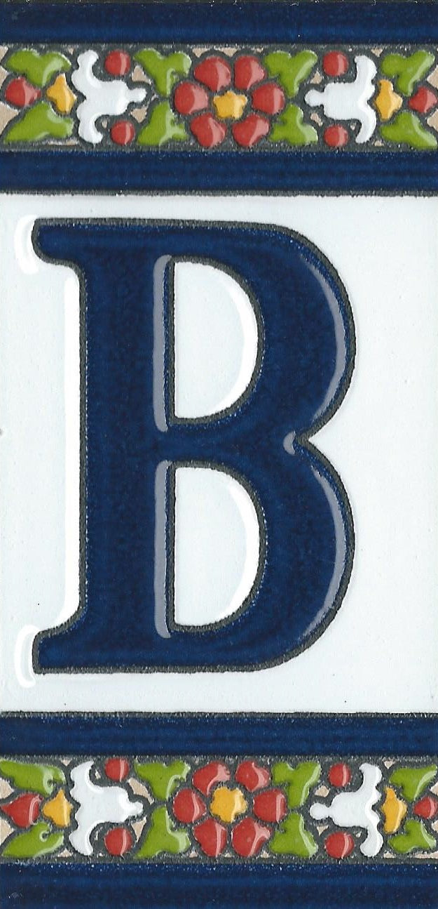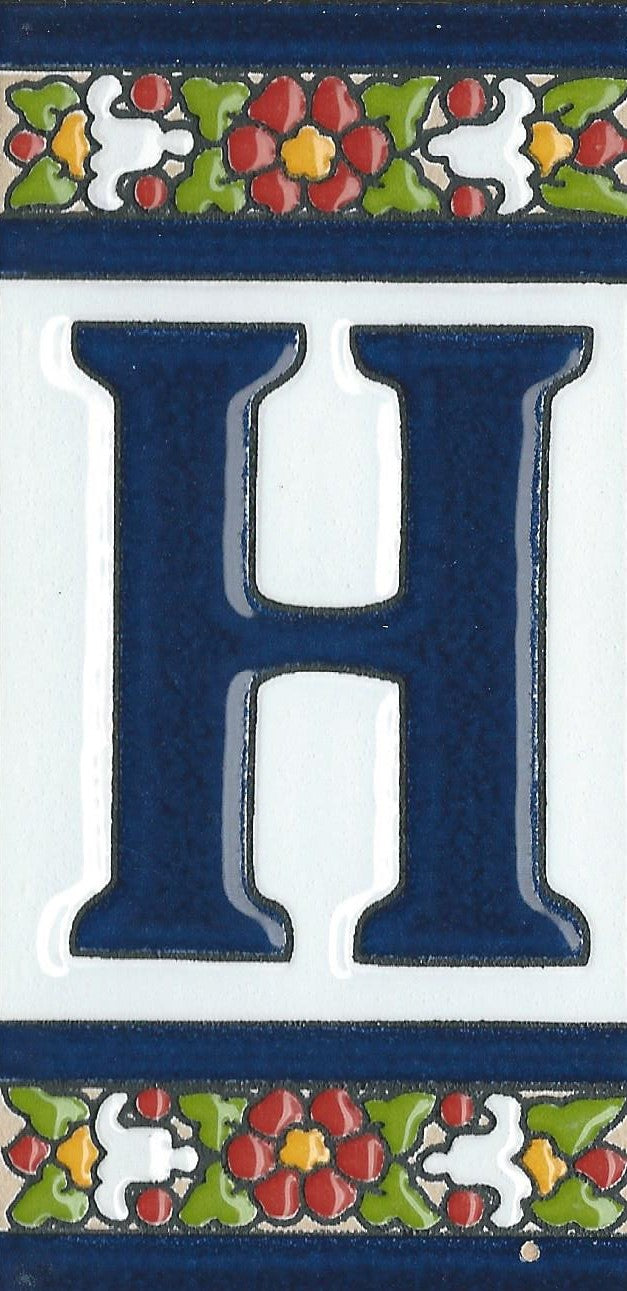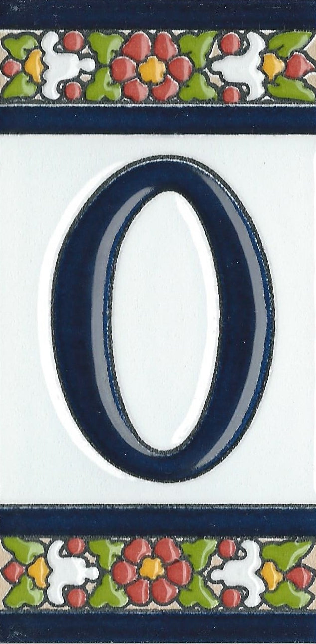 Hand-painted ceramic floral tiles with numbers and letters using the traditional Spanish dry rope technique. Perfect for creating signs with your house number or name. Select your favourite design and build your unique ceramic house or flat number.